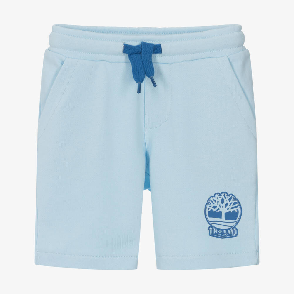 Boys pale blue shorts by Timberland, made in soft and comfortable organic cotton jersey. In a casual style with slanted front pockets, they feature the brand's iconic tree logo in contrasting blue. The elasticated waistband has coordinating blue drawstring ties to ensure a great fit.