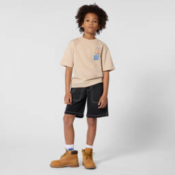Ivory organic cotton T-shirt for little boys unmistakably by Timberland, with a large orange logo and sea plane print on the front. It is made in soft, comfortable jersey, with poppers on one shoulder for speedy dressing.