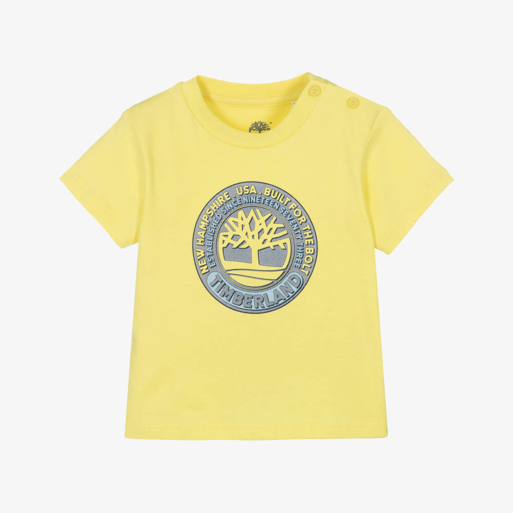 Yellow organic cotton T-shirt for little boys by Timberland, with the brand's signature Tree logo printed on the front in pale blue and yellow. Made in comfortable jersey with poppers on one shoulder to help with dressing, it is ideal for relaxed, casual days.
