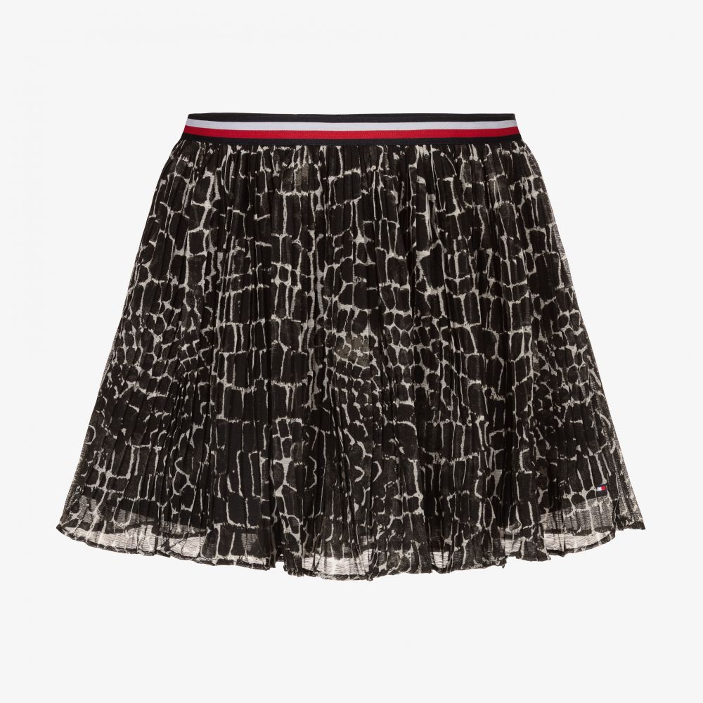 Black and ivory animal print skirt for girls by American brand Tommy Hilfiger. Made in sheer, pleated recycled chiffon, it has a comfortable elasticated waistband striped in the designer's signature colours of red, white and navy blue.