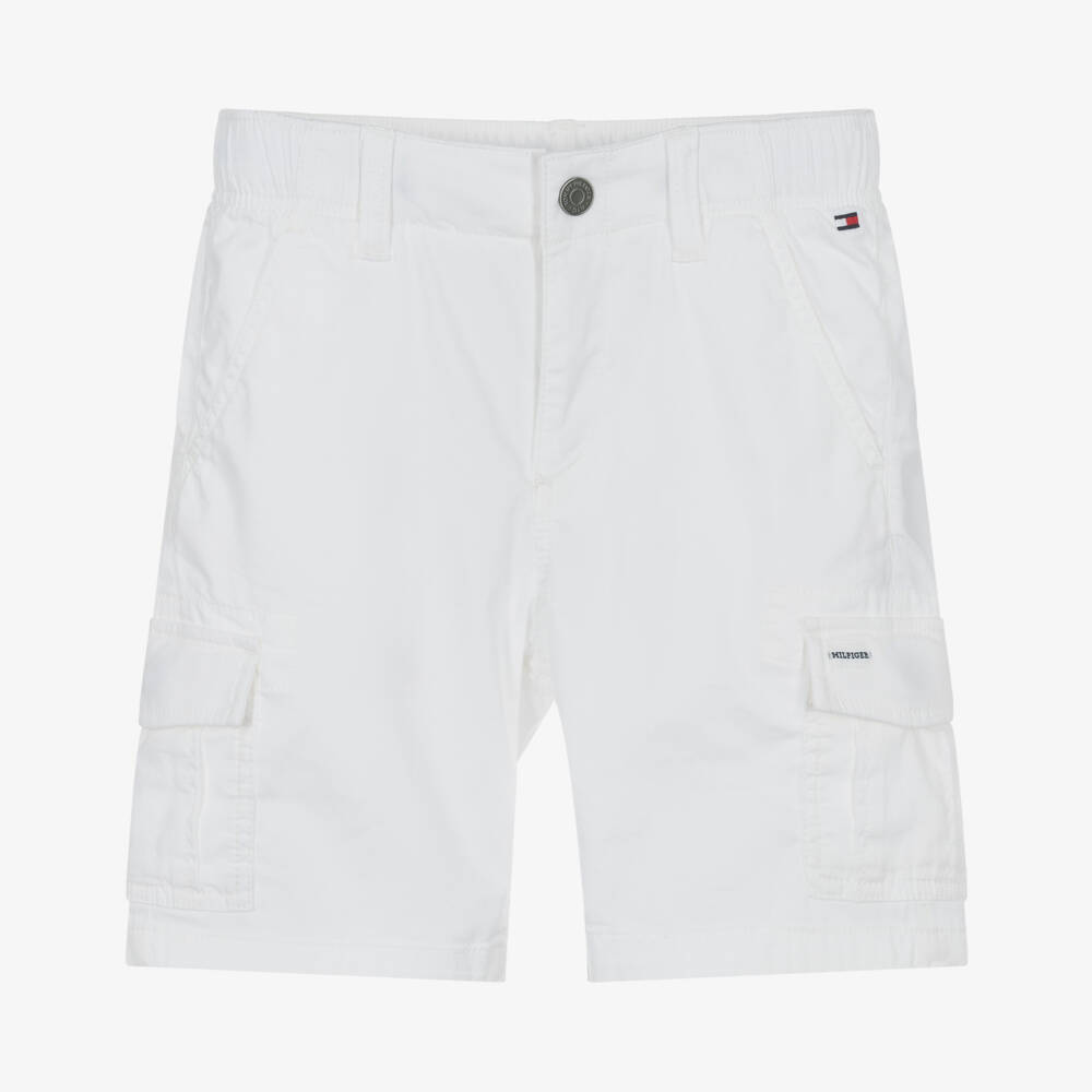Classic off-white cotton cargo shorts for boys by Tommy Hilfiger. Designed with comfort and practical style in mind, they have a part elasticated waistband and multiple pockets including popper fastening flap pockets on each leg. The iconic flag embroidery and logo tab give them an understated designer touch.