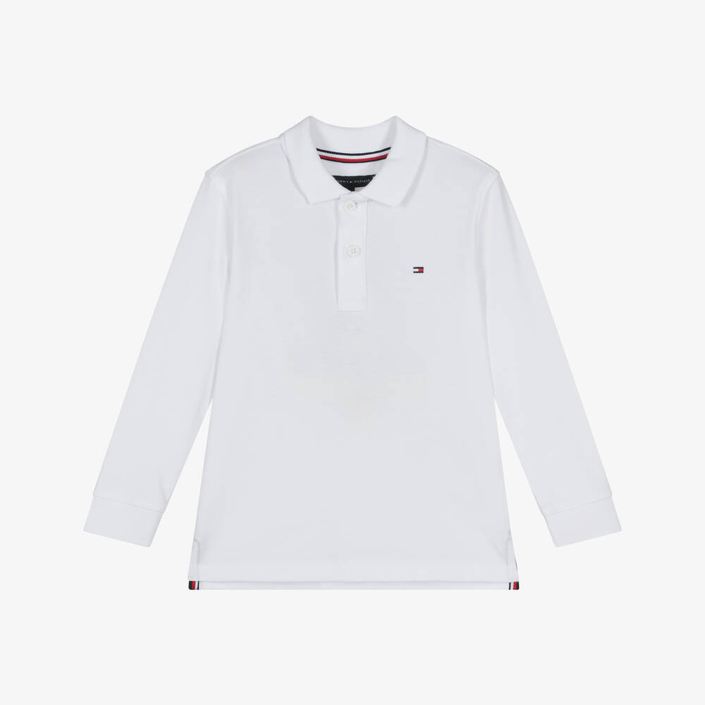 A casual white long-sleeved polo shirt for boys by Tommy Hilfiger, made in soft and comfortable cotton piqué. This classic, sporty style has a ribbed collar and branded button fastenings. The iconic flag logo is embroidered on the chest and the split hem is trimmed with the brand's signature stripes.