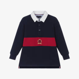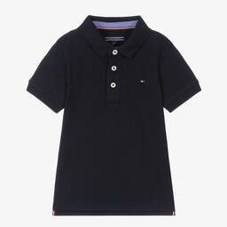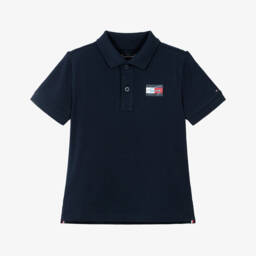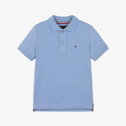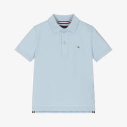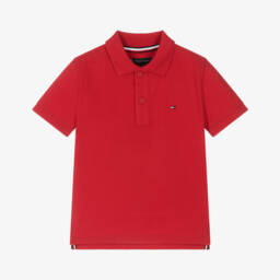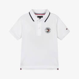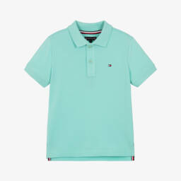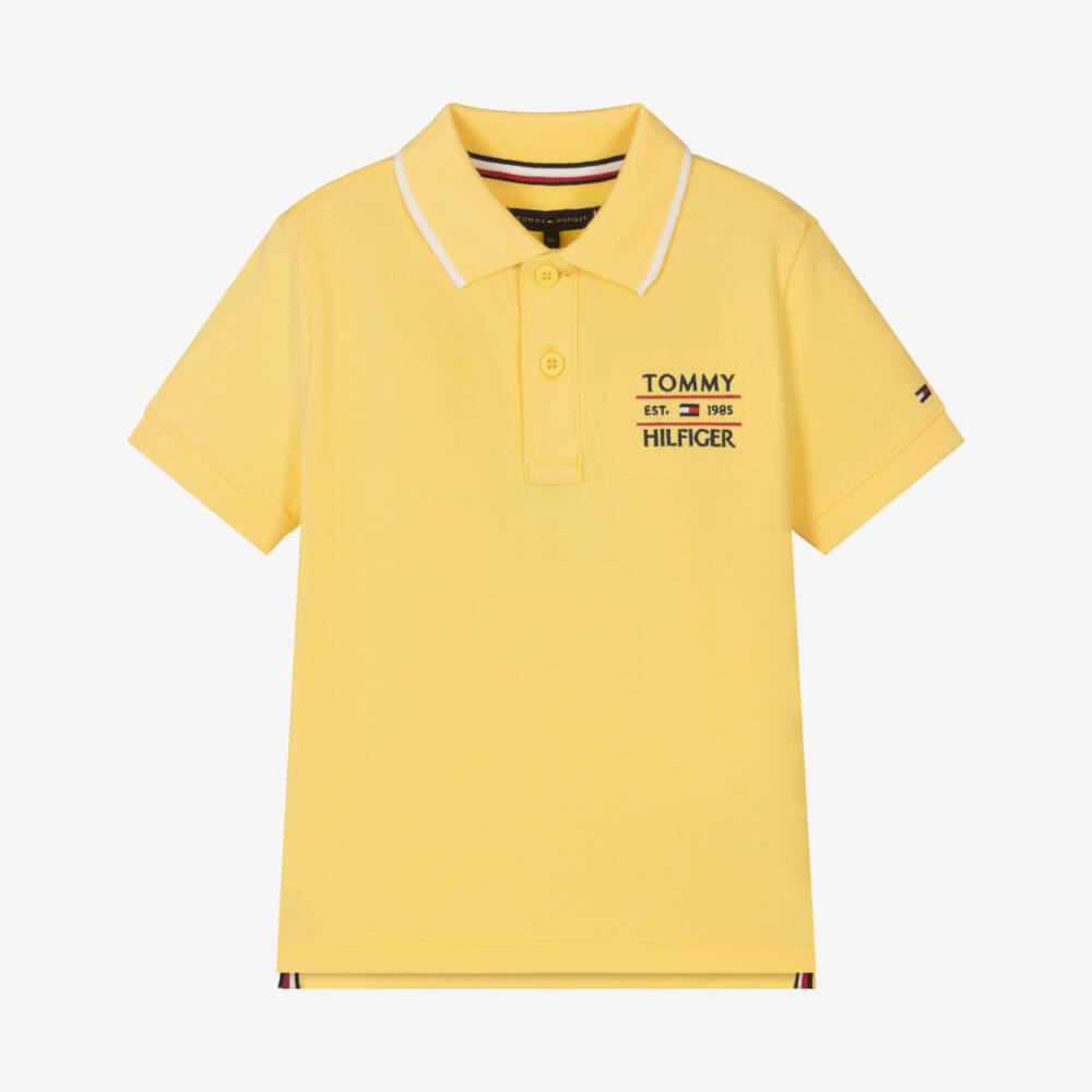 Bright yellow polo shirt for boys by Tommy Hilfiger, made in comfortable cotton piqué. This casual style has a ribbed collar with white tipping and a striped underside, and a neat button placket. The brand's logo is embroidered on the chest in their signature colours.