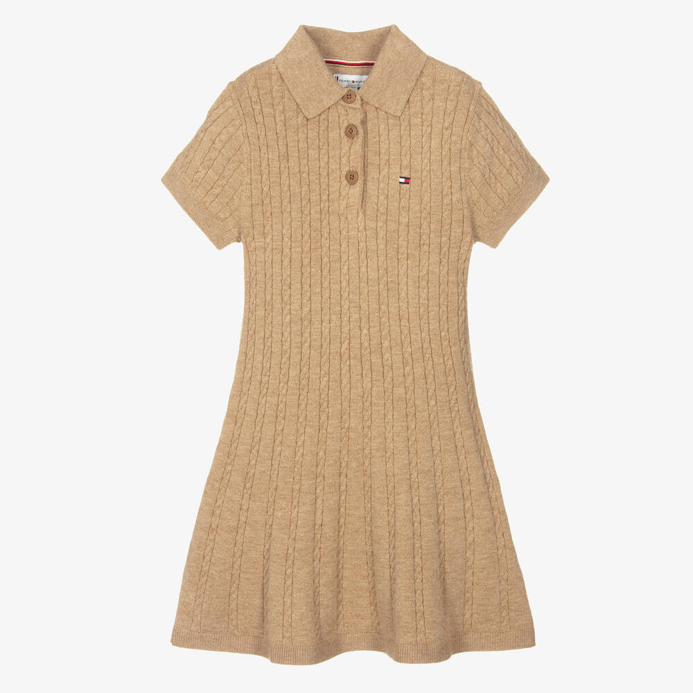 A lovely beige knitted dress for girls by Tommy Hilfiger, in a fit and flare design, combining style and comfort. Made in a soft viscose blend, this short-sleeved dress has a classic cable pattern and a polo design with a ribbed collar and button fastenings. The American brand's signature flag is embroidered on the chest for a distinctive designer touch.