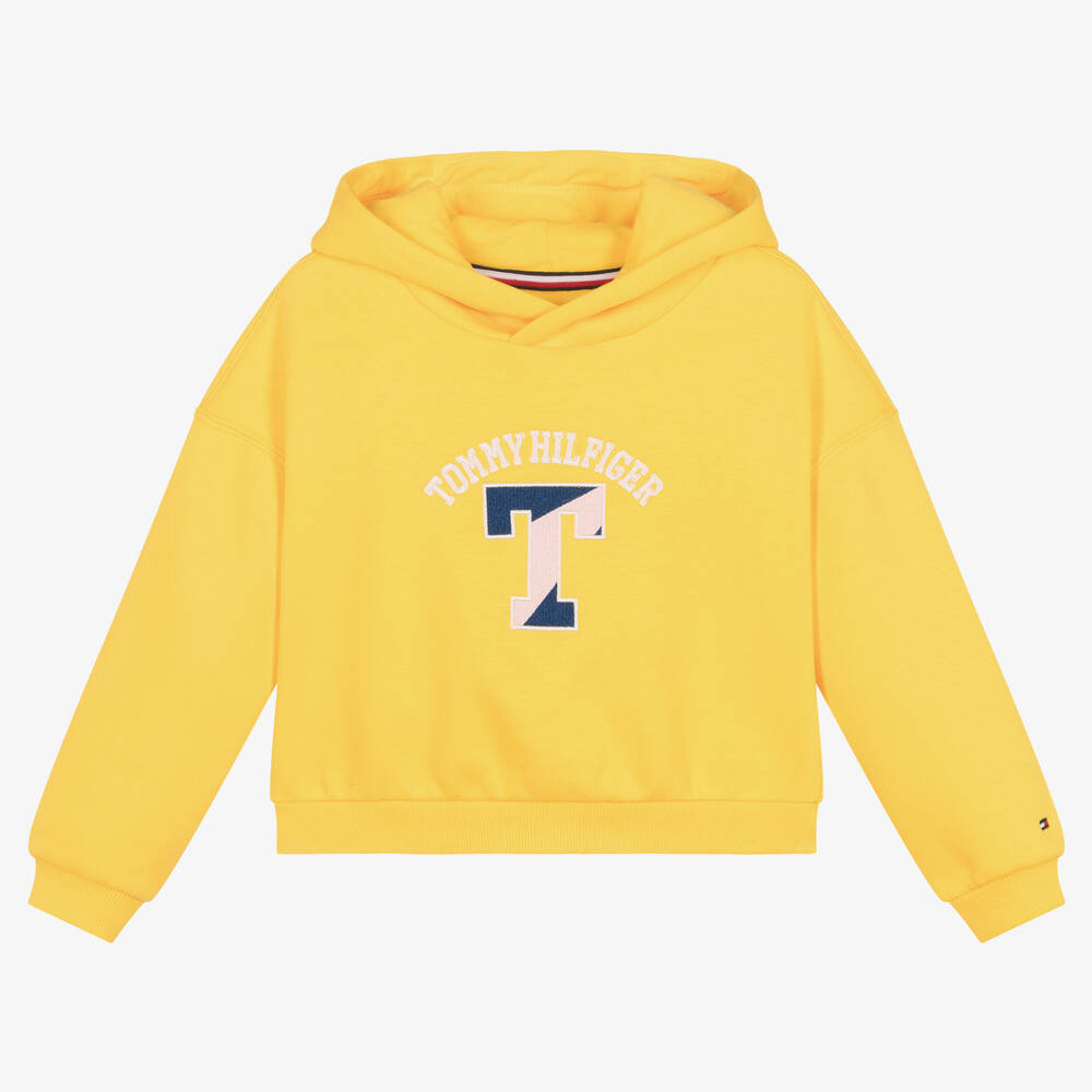 Bright yellow hoodie for girls by American brand Tommy Hilfiger, made in comfortable cotton sweatshirt jersey with a cosy fleece feel inside. It has a varsity-style logo embroidered and appliquéd on the front in pink and navy blue, and the iconic flag logo is embroidered on one cuff.