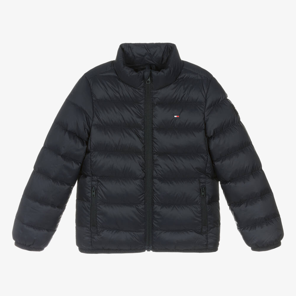 Soft and smooth, this down-padded navy blue jacket for boys and girls is by Tommy Hilfiger. Fully lined, this lightweight jacket has fleece-lined zipped pockets for extra comfort and a front zip fastening with a protective chin guard. There is a printed logo on the back of the neckline, an embroidered flag logo on the chest, and a branded trim on the armholes and hem for a signature finish. The outer material of this product is made from at least 95% recycled nylon.