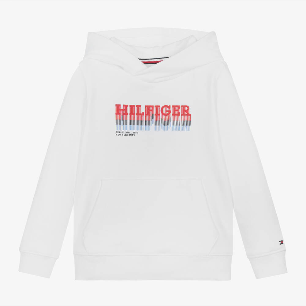 A white hoodie for boys and girls by American brand Tommy Hilfiger, made from soft and comfortable cotton jersey. It is casually styled with long sleeves and stretchy ribbed trims, with a useful pouch pocket on the front adding to the relaxed look. For designer appeal, there is a cool monotype logo design on the front in red, black and blue, along with an embroidered flag logo on one sleeve.