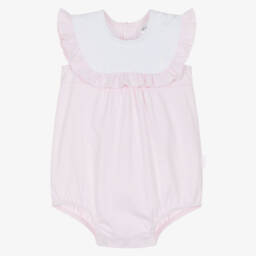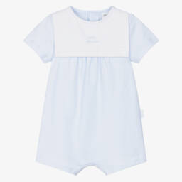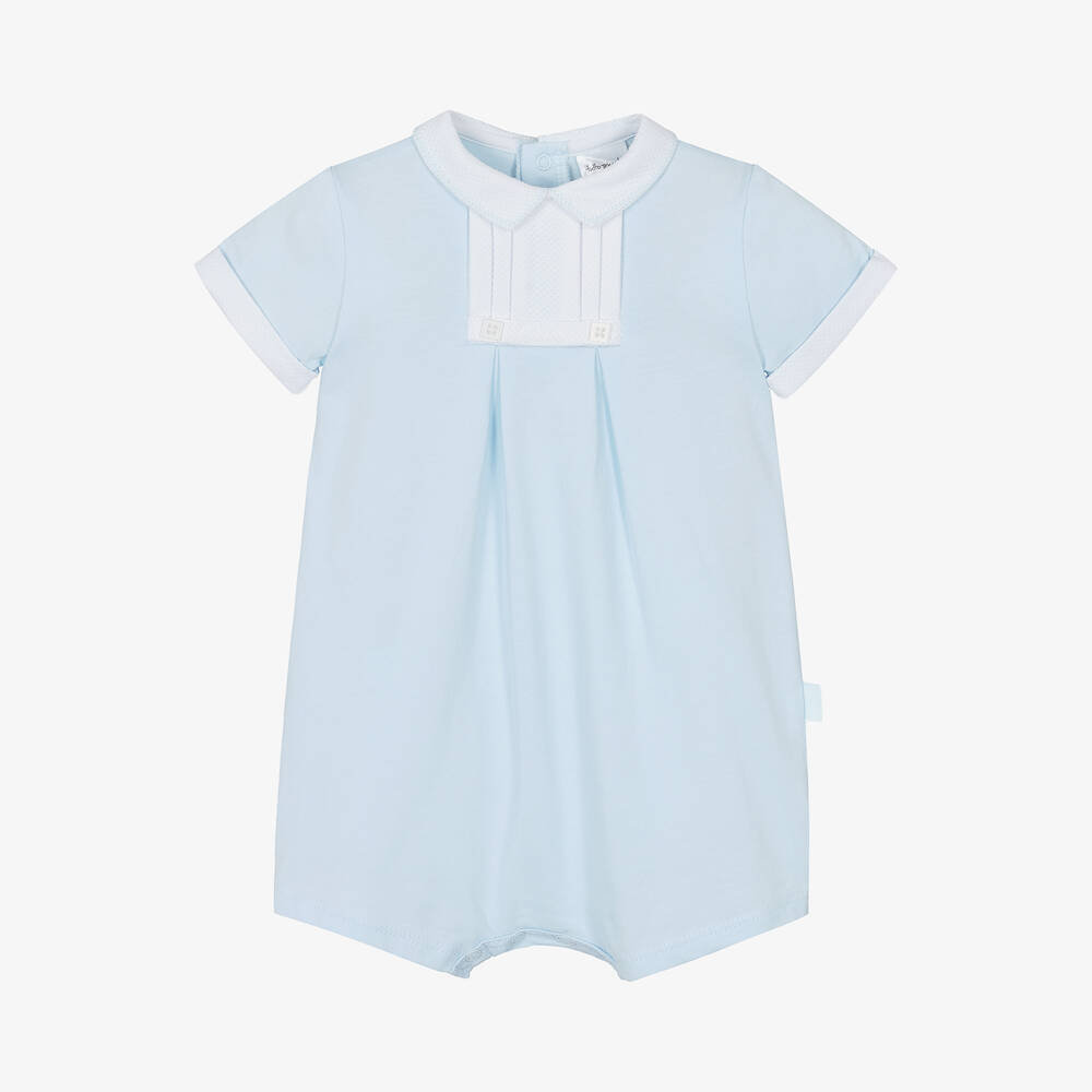 A charming pale blue shortie for baby boys by Tutto Piccolo, made in soft and comfortable cotton jersey. Adding contrast, it has waffle textured white trims with pleats, decorative buttons and embroidery detail. Poppers on the back and between the legs help with dressing.