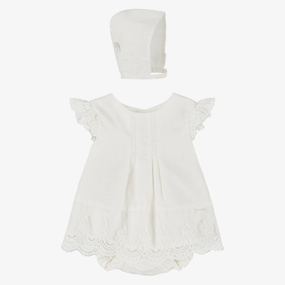 Baby Girls White Linen Dress, Bonnet & Bloomers Set