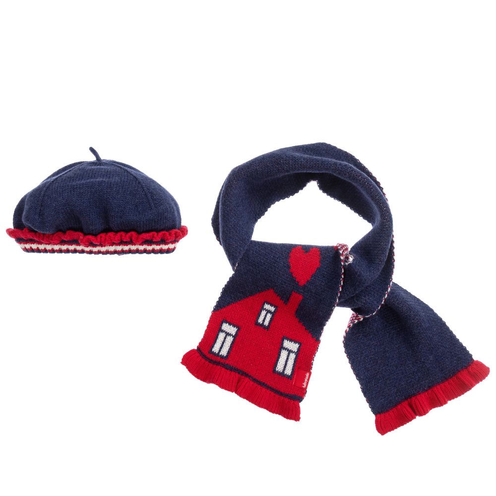 Navy blue hat and scarf set for girls by Tutto Piccolo, with red detailing. Knitted in a soft angora wool blend, the beret style hat has a grosgrain ribbon bow and the scarf has a woven house motif.
