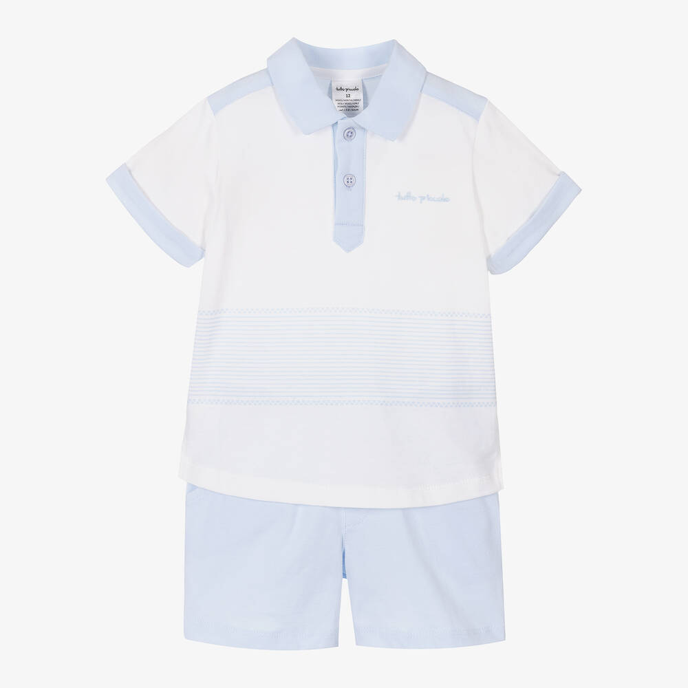 Casual and comfortable, this white and pale blue cotton jersey shorts set for younger boys is from Tutto Piccolo. The polo shirt has charming striped prints, logo embroidery, rolled-up short sleeves and button fastenings. The pull-on shorts have two pockets on the front.