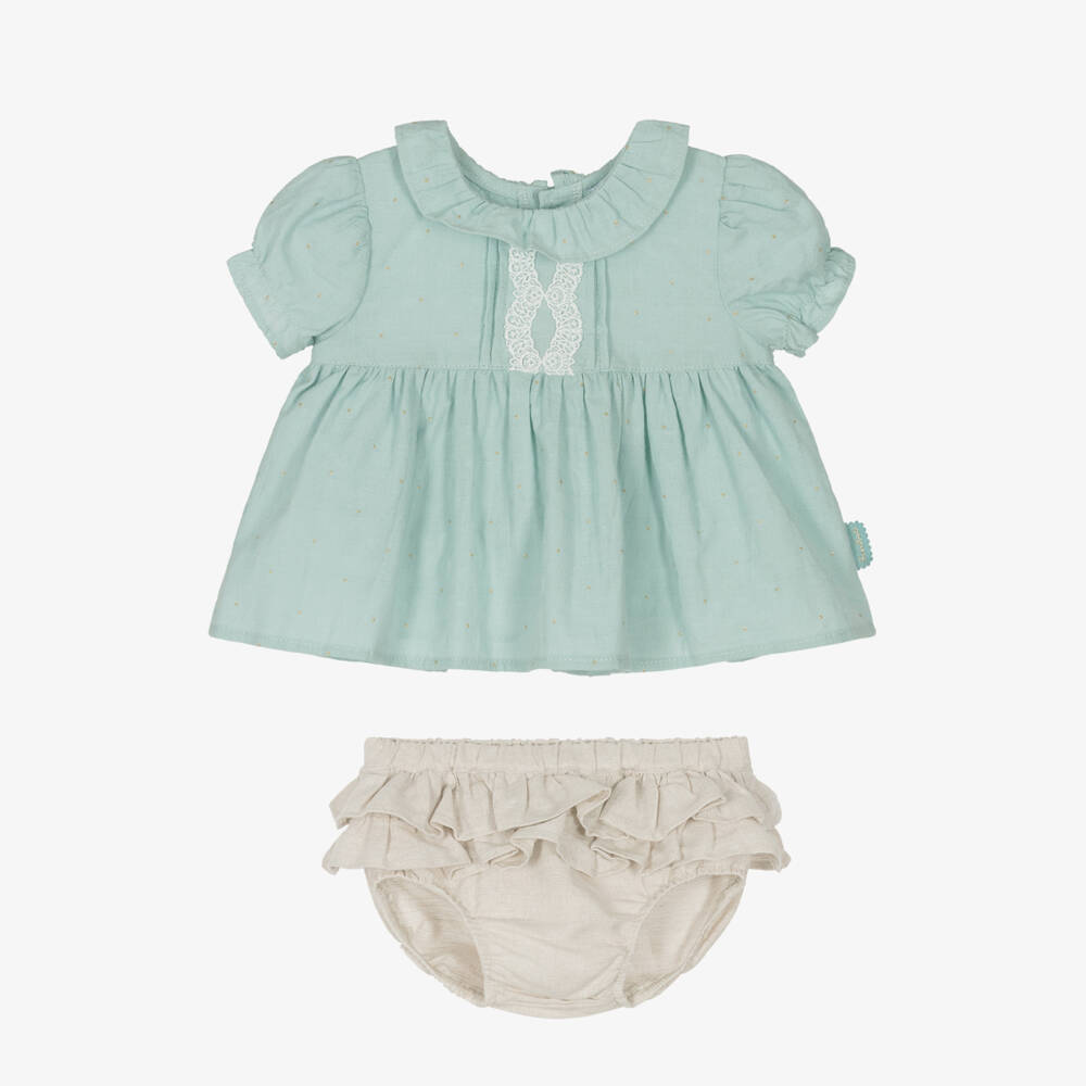 A lovely green and beige shorts set for little girls by Tutto Piccolo. The soft, lightweight cotton blouse is printed with glittery gold dots for a touch of sparkle, with pretty puffed sleeves and a delicate white lace trim on the bodice. The cotton and linen blend bloomer shorts are decorated with pretty tiered ruffles and have a comfortable elasticated waist.