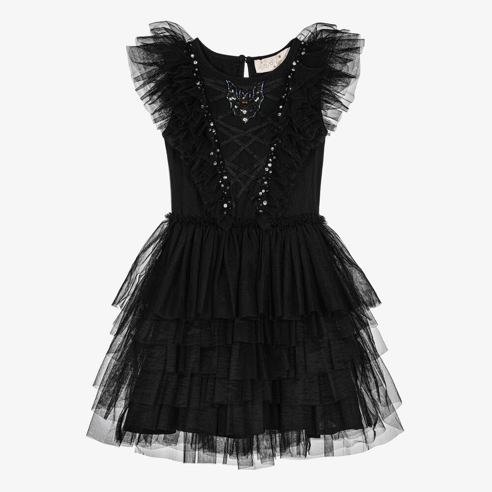 Inspired by the Halloween season, this black dress for girls by Tutu du Monde is made with layers of the finest tulle. Stylishly spooky, this tulle-trimmed design has oversized ruffle sleeves and corset style appliqués on the bodice. Sparkly beads and coloured gems shape a ghostly bat on the chest. It has a voluminous ruffled tutu skirt, lined in soft cotton for comfort. It fastens with a simple keyhole button on the back. Items are made to last and become more lovely with wear as slight fading and fraying edges adds to their charm.