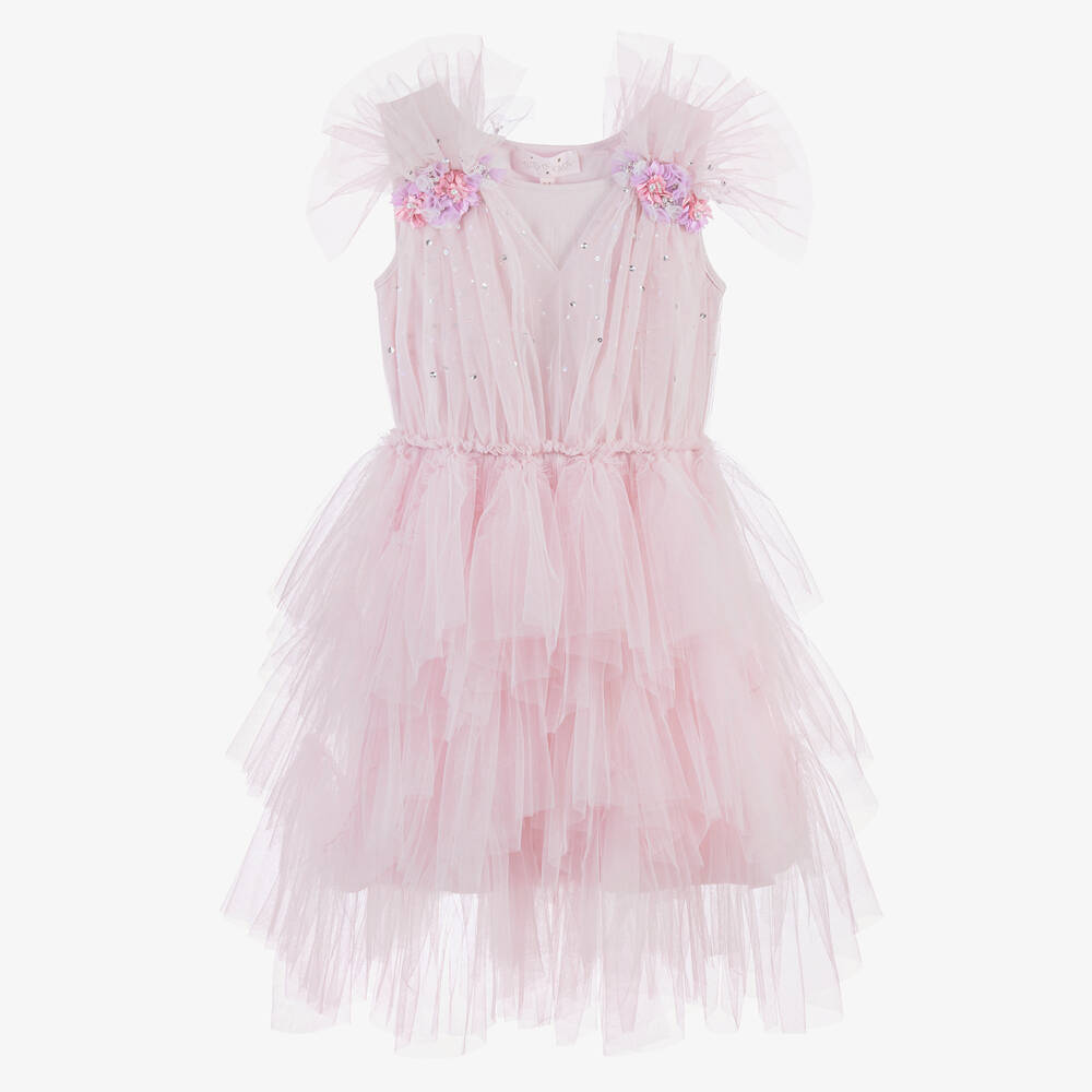 Pretty tulle tutu dress for girls by Tutu du Monde in a lovely lilac pink shade. Combining a special occasion look with comfortable wear, the dress has a soft jersey bodice, allowing it to slip easily over the head. The bodice has a fine tulle overlay that fans at the shoulders for a feminine touch. The front has hand-sewn beads and sequins, with beautiful beaded and floral decorations on the shoulders in lilac and pink. Gently elasticated at the waist, the voluminous skirt falls in ruffled tiers for a stunning finish. Items are made to last and become more lovely with wear as slight fading and fraying edges add to their charm.