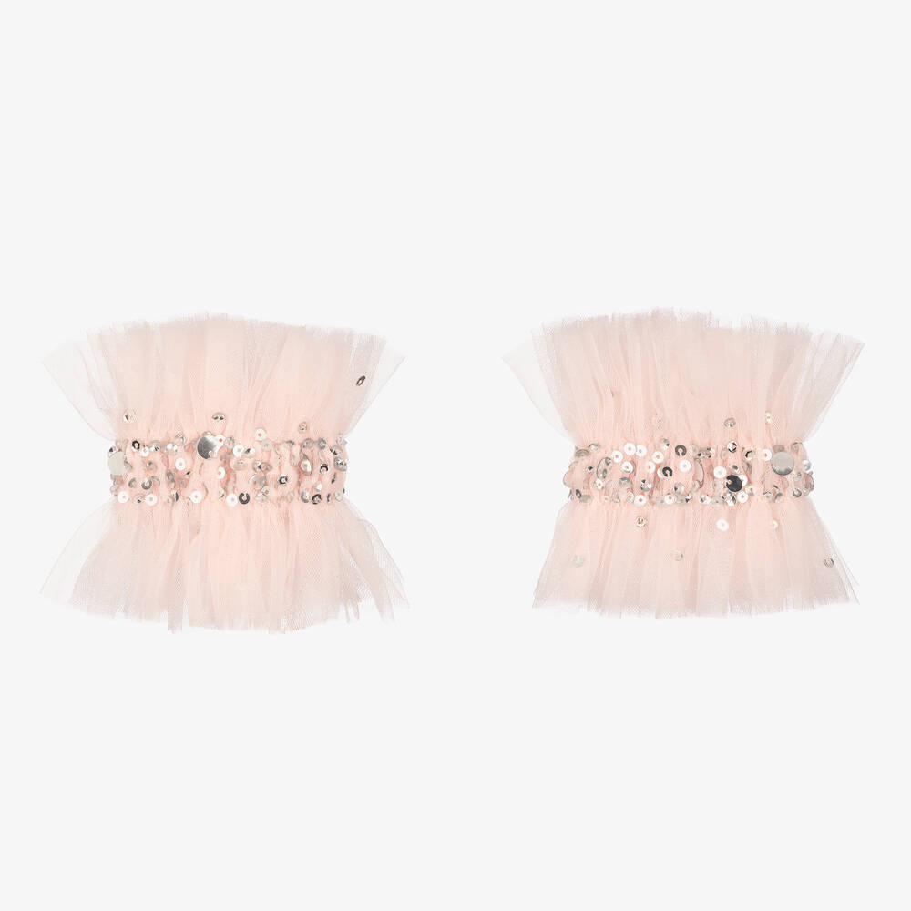 Light pink bracelet cuffs for girls by Tutu du Monde. To finish off an outfit, these pretty, elasticated cuffs are decorated with silver sequins which sparkle beautifully in the light. Items are made to last and become more lovely with wear as slight fading and fraying edges adds to their charm.