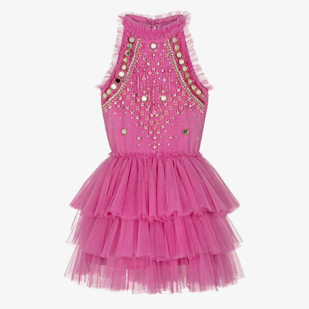 A stunning halter neck dress for girls by Australian brand Tutu du Monde, made in soft tulle. This eye-catching design is beautifully hand-embellished with sparkling beads and sequins on the bodice, with layers of tiered ruffles on the voluminous tutu skirt. Lined in lightweight cotton for comfort, the dress fastens with an elegant keyhole button on the back.