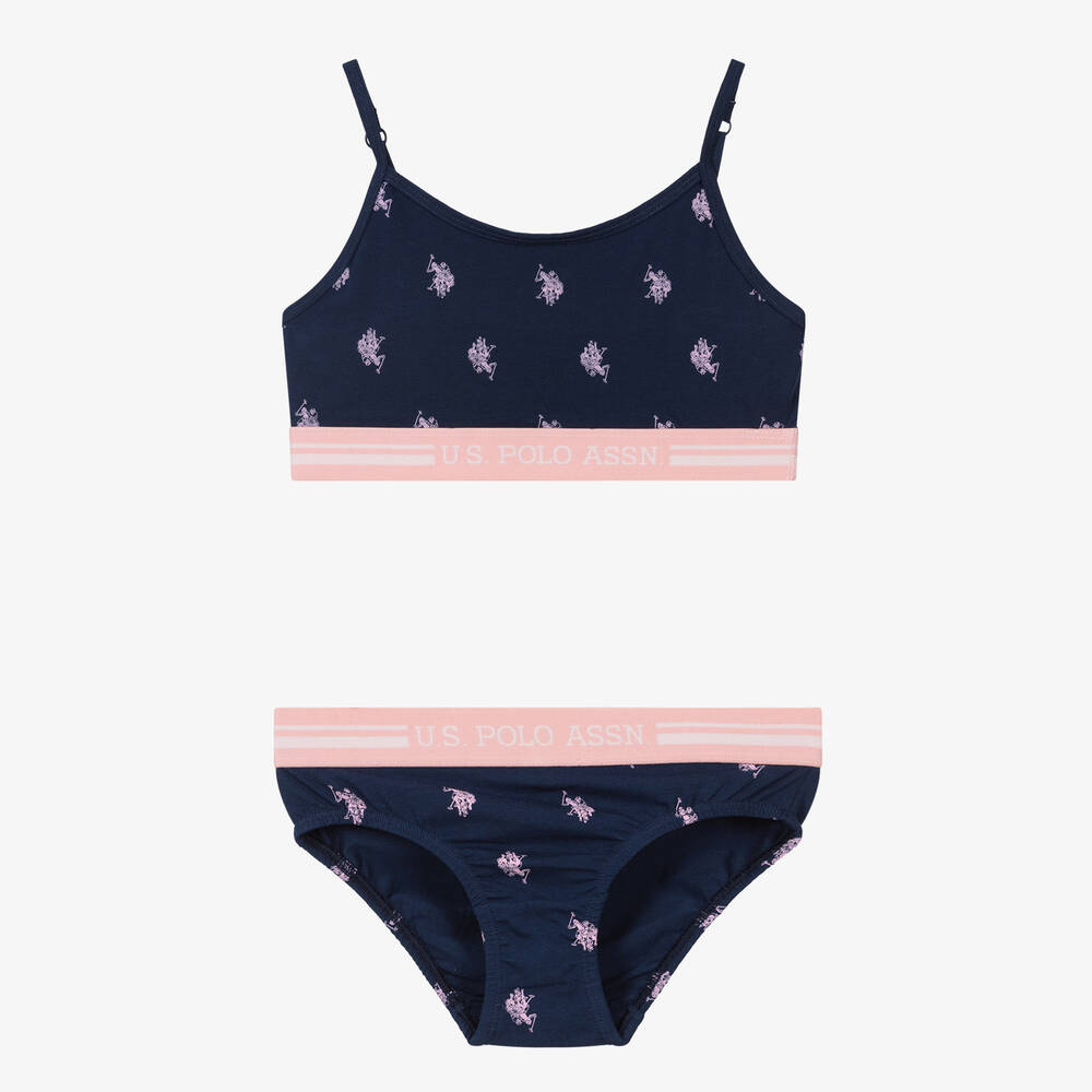 In navy blue with pink branded trims, this bralette and knickers set for girls is by U.S. Polo Assn.. Made in soft cotton jersey, both pieces have an all-over double horseman logo in pink, with elasticated trims for comfort. The bralette has adjustable shoulder straps for a good fit.