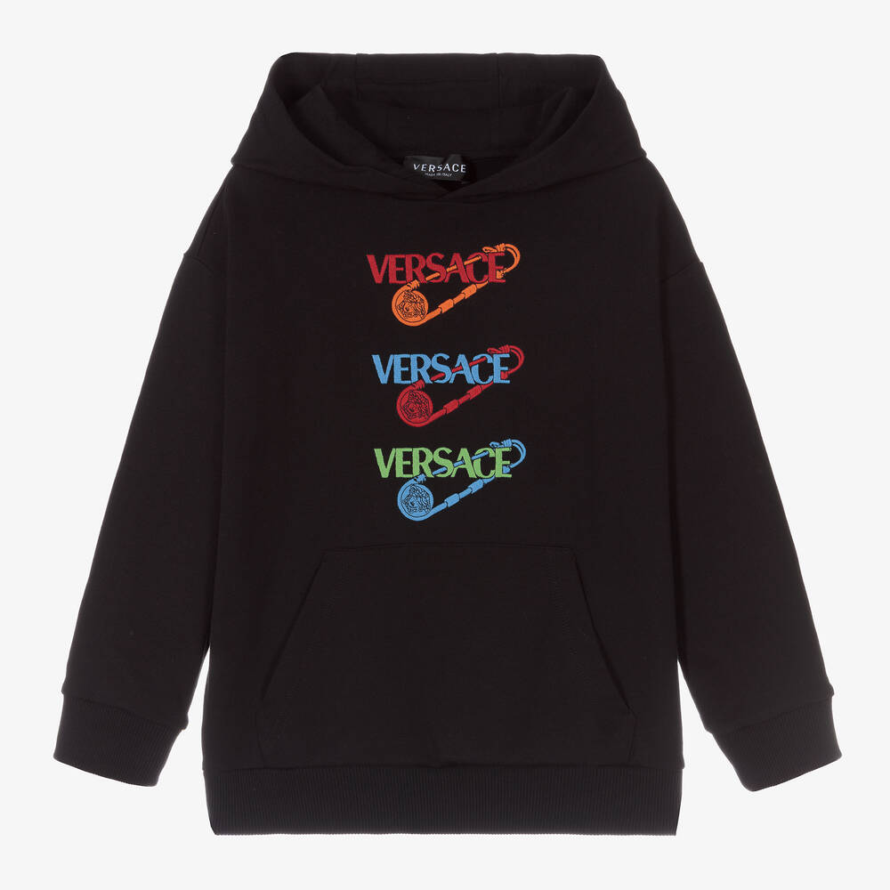 Black hooded sweatshirt for girls and boys from luxury Italian brand, Versace. Made in cotton sweatshirt jersey, the front has colourful logo embroidery of safety pins detailed with the brand's iconic Medusa. It is finished with a pouch pocket and ribbed trims.