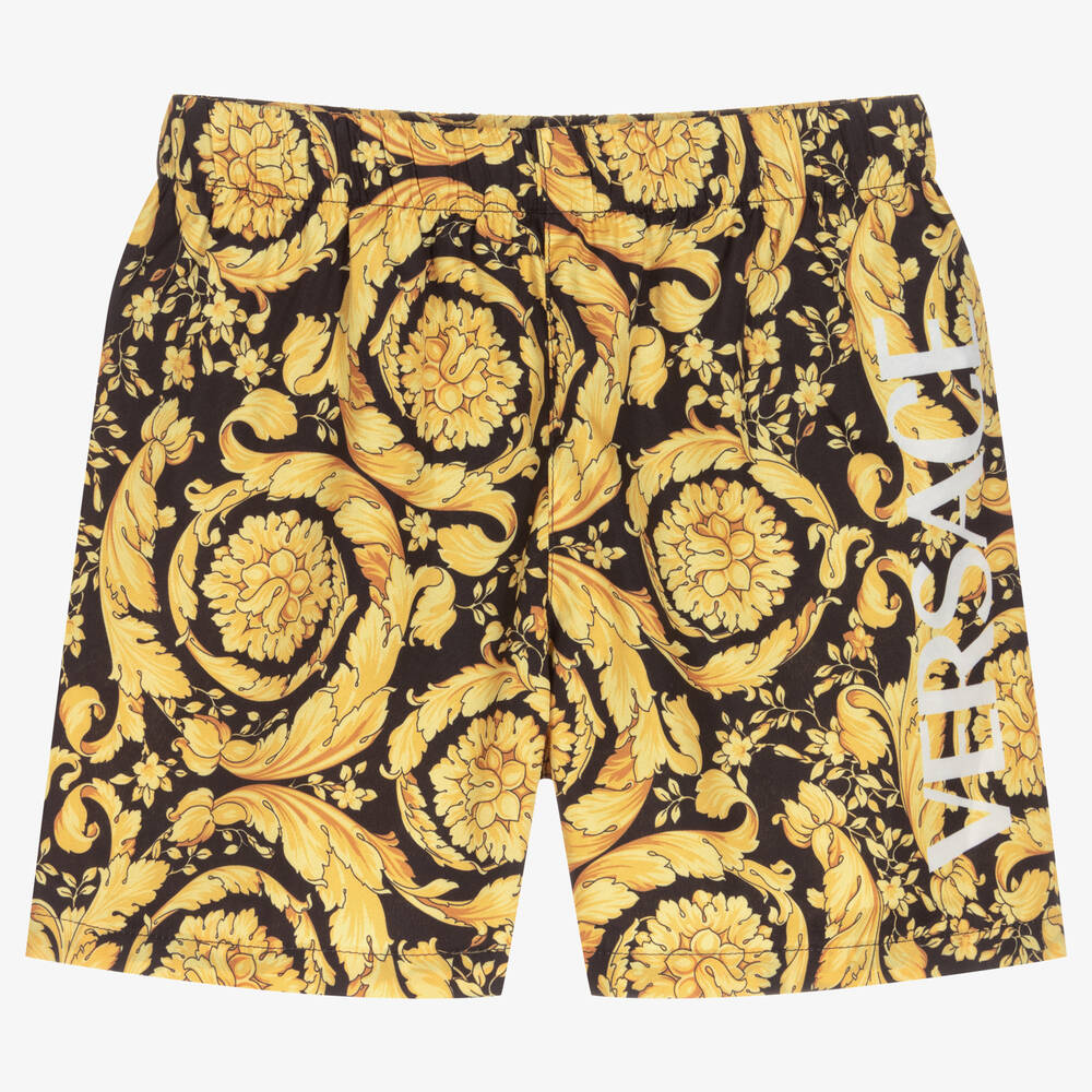 Boys black and gold swim shorts by luxury brand Versace, beautifully patterned with the opulent Barocco design. Silky and lightweight with a stretchy jersey lining, these recognisable designer shorts have a white logo print on one leg and a comfortable elasticated waistband.