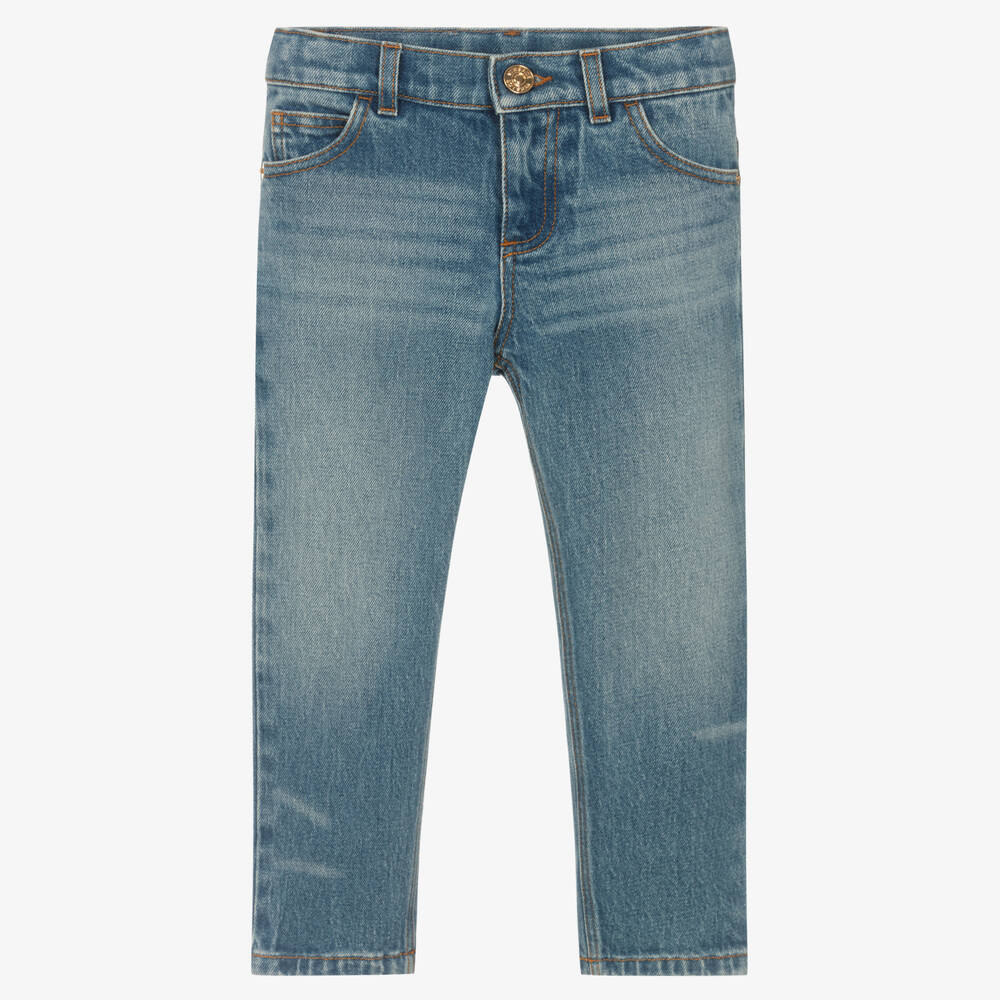 Mid-blue wash denim jeans for boys, by luxury Italian designer Versace. Soft with a slight stretch, the iconic logos feature on the shiny gold rivets and the faux tan leather badge on the back of the waist. Regular fitting, they fasten with a button and zip and have an adjustable waist for a great fit.