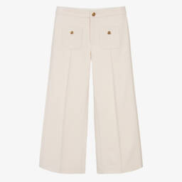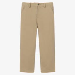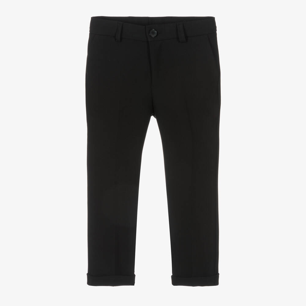 Smart black trousers for boys by luxury Italian designer Versace, made in a soft, mid-weight viscose cotton blend. They have a zip and button fastening, front pockets and an adjustable waistband. For a simple yet striking style, they have turn-up hems and pockets with an intricate branded patch logo on the back.
