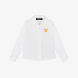 A smart white cotton shirt for boys by luxury Italian label Versace, featuring the brand's distinctive black logo patch on one cuff. Made from soft, lightweight poplin, this classic style is completed with gold-tone Medusa embossed buttons on the neckline and cuffs.