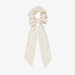 Stunning ivory and grey hair scrunchie for girls from luxury label Versace. This lovely piece is made from silky smooth fabric printed with the iconic Barocco print and finished with a gold Medusa head for instant recognition.