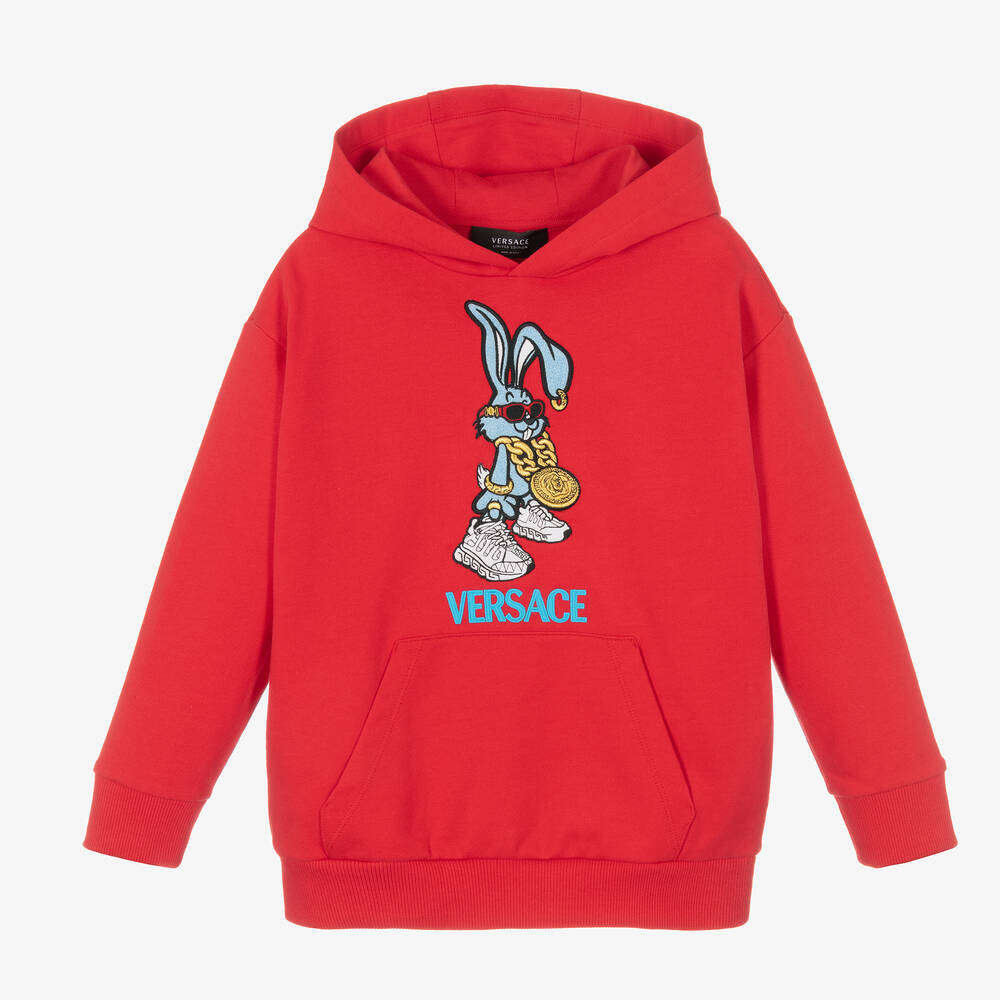 Red hoodie for boys and girls, by luxury Italian brand Versace. This sweatshirt has an embroidered Biggie Bunny logo in a terry towelling design. Made in soft cotton jersey, it has ribbed trims and a large pouch pocket.