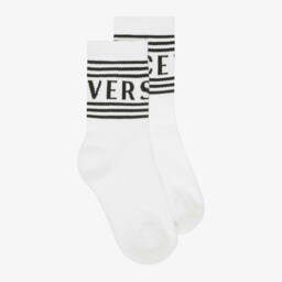 Red and ivory socks for boys and girls by luxury designer Versace, presented in a branded gift box. These festive socks are made in a beautifully soft virgin wool blend with ribbed trims. They have a timeless Fair Isle jacquard pattern with signature logo branding around the ankle.