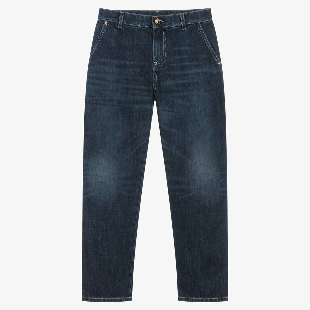 In a cool, straight-leg fit these mid-blue jeans for teen boys are by the luxury Italian designer Versace. In a four-pocket design, they feature an embroidered logo on one of the back patch pockets. Made in soft denim, with a slightly washed effect, they fasten with a zip and stunning gold Medusa logo button, with a small Medusa stud and branded rivets adding an extra designer touch.