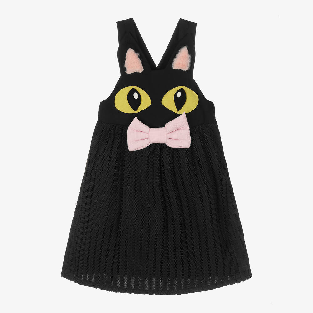 A black pinafore dress for girls by Wauw Capow, fully lined with comfortable cotton. Full of character, the bib front features an adorable cat face, with cute eyes, pink fluffy ears and a crinkled bow detail. The skirt has a striped honeycomb-effect detailing. The shoulder straps are adjustable with buttons for a good fit and the side has button closures to help with dressing.