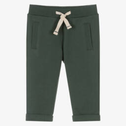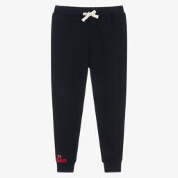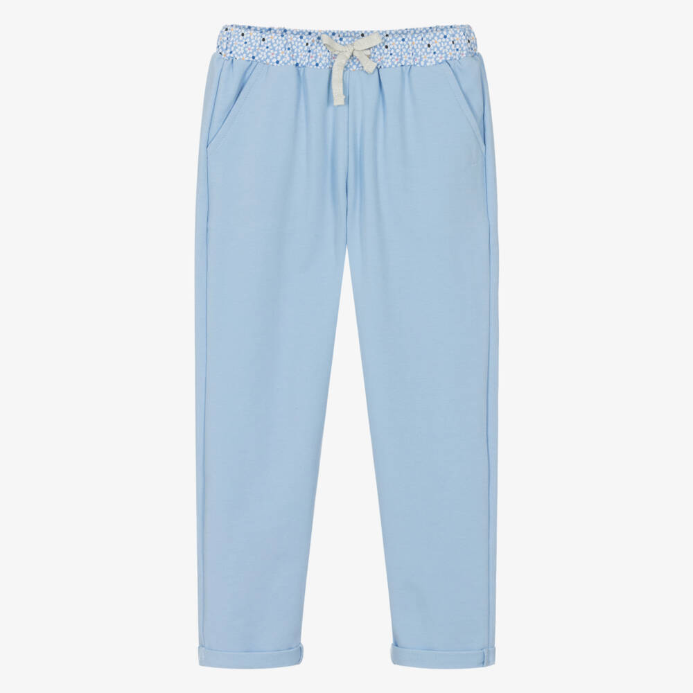 Pale blue joggers for girls by Week-end à la mer, made in comfortable cotton jersey. The elasticated waistband is patterned in a pretty floral print and has a sparkly silver drawstring tie. There are slanted front pockets, with a small branded pocket on the back.