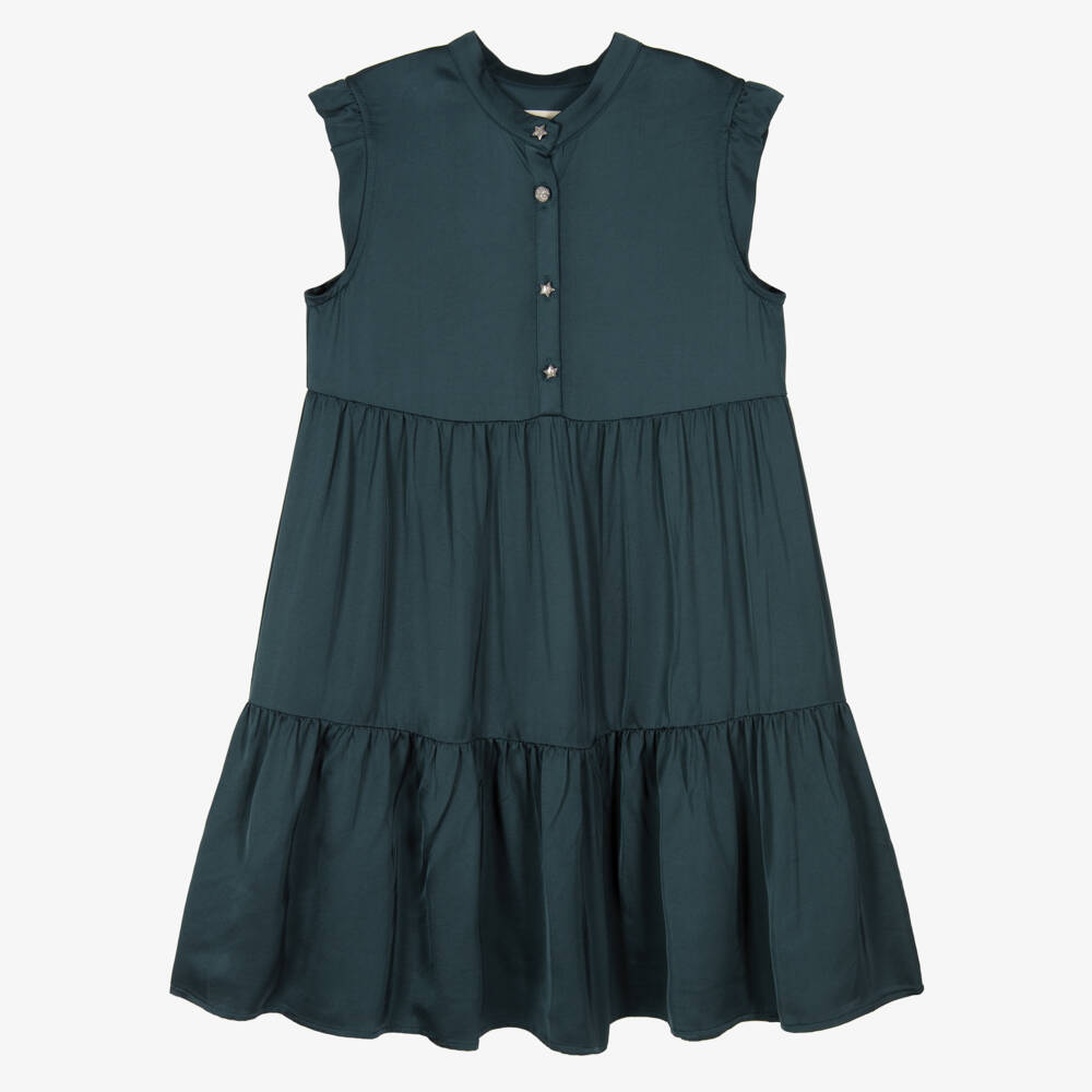In a lovely deep shade of teal blue, this Mini-me dress for girls by Zadig&Voltaire, is made in a silky viscose satin. An elegant yet comfortable style, it has neat ruffles trimming the shoulder and gently gathered tiers on the full, floaty skirt. It fastens on the front with sparkly silver buttons for a stylish finishing touch.