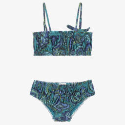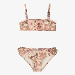 A gorgeous floral bikini for girls by luxury brand Zimmermann, designed in contrasting blue, pink and beige shades. This stylish resort wear two-piece is lined for comfort and trimmed with beautiful crochet-trimmed ruffles.