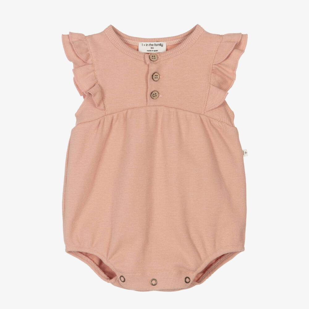 Super soft pink cotton jersey shortie for baby girls from 1 + in the family, with adorable ruffles on the shoulders. It has wooden button fastenings to make pulling it over your little one's head easier and poppers between the legs to allow quicker changes and ensure it stays neatly tucked in.