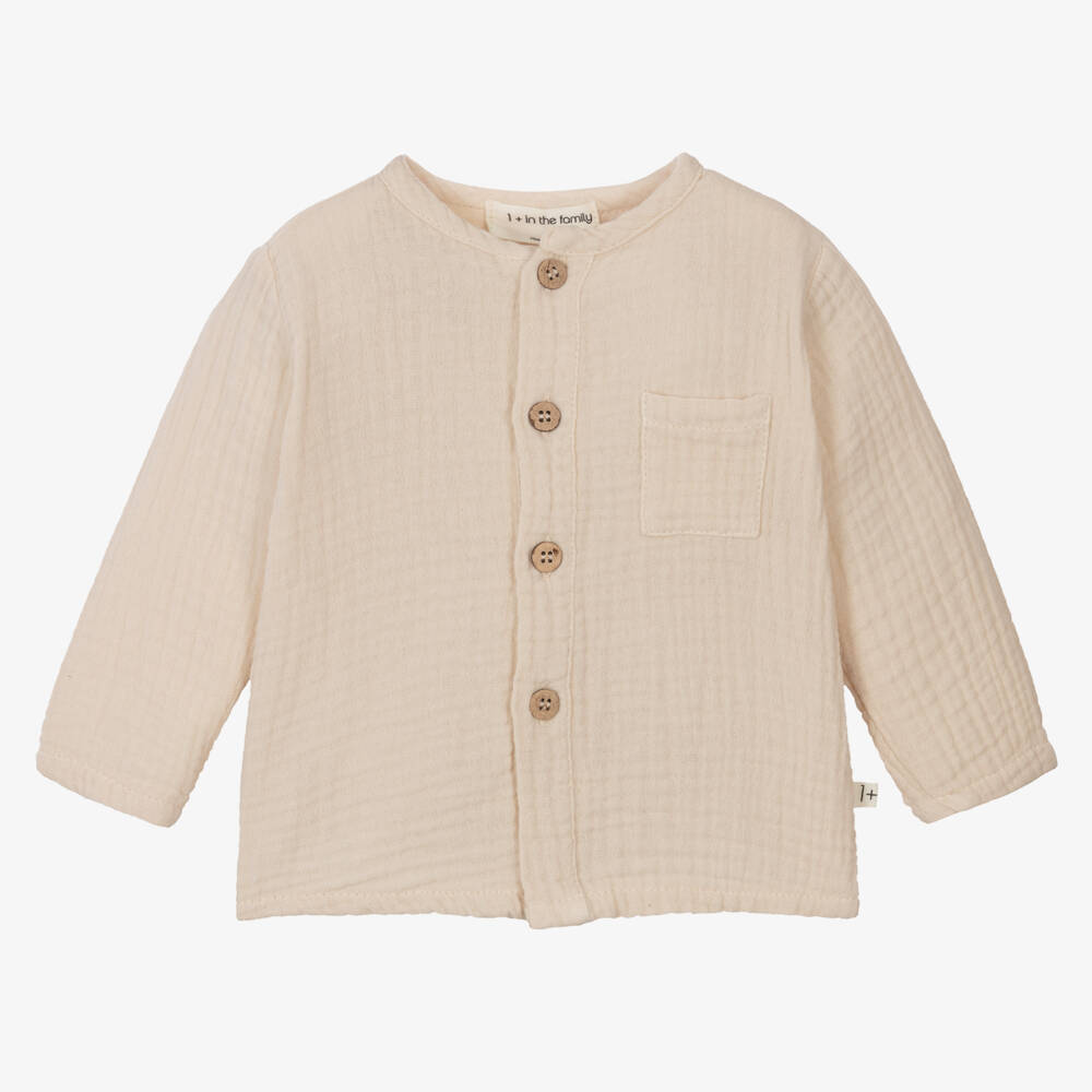 Beige shirt for little boys and girls by 1 + in the family, made in lightweight cotton seersucker. Cool and comfortable, it has a little chest pocket and a small logo tab on the side. This casual, collarless shirt fastens with wooden buttons on the front.