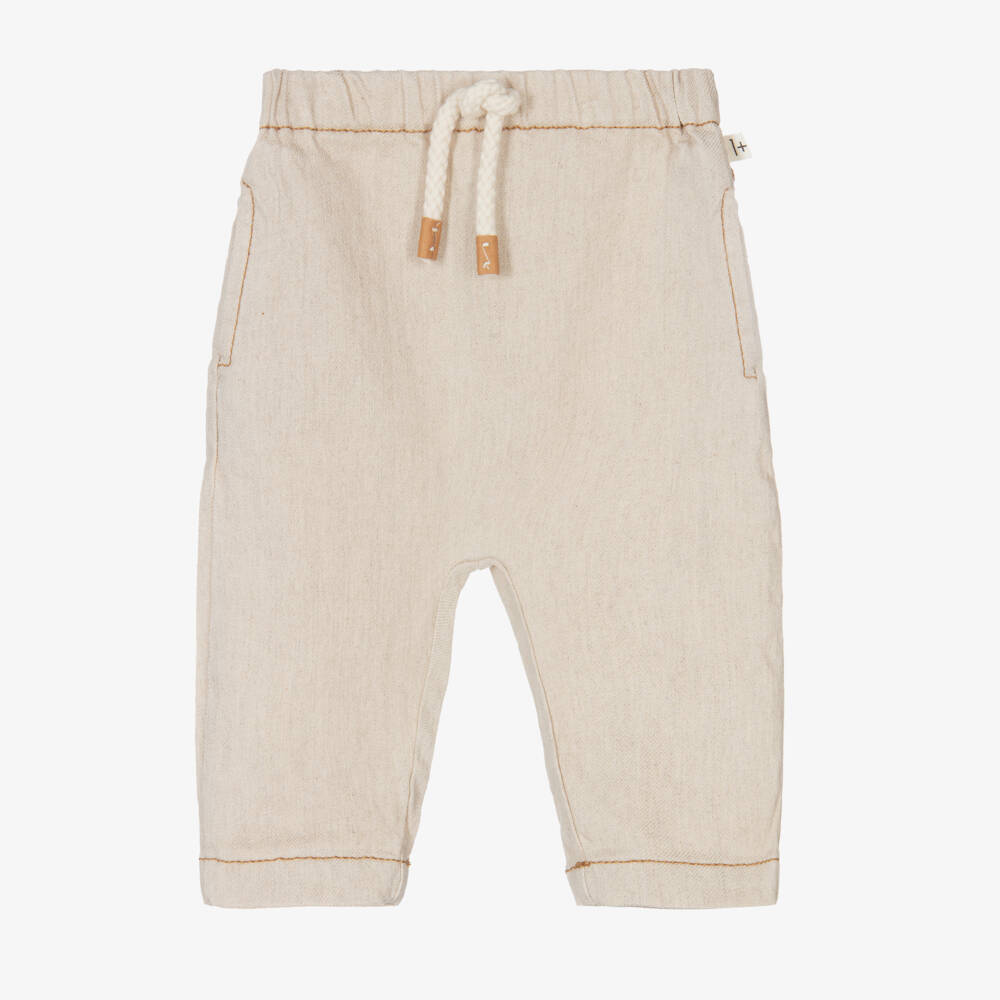 Casual beige trousers for little boys and girls from 1 + in the family. Made in a linen and cotton blend, they are lightweight with slight stretch for a comfortable fit. They have useful side seam pockets and a back patch pocket. The elasticated waist makes them easy to pull on and there is a decorative drawstring on the front.