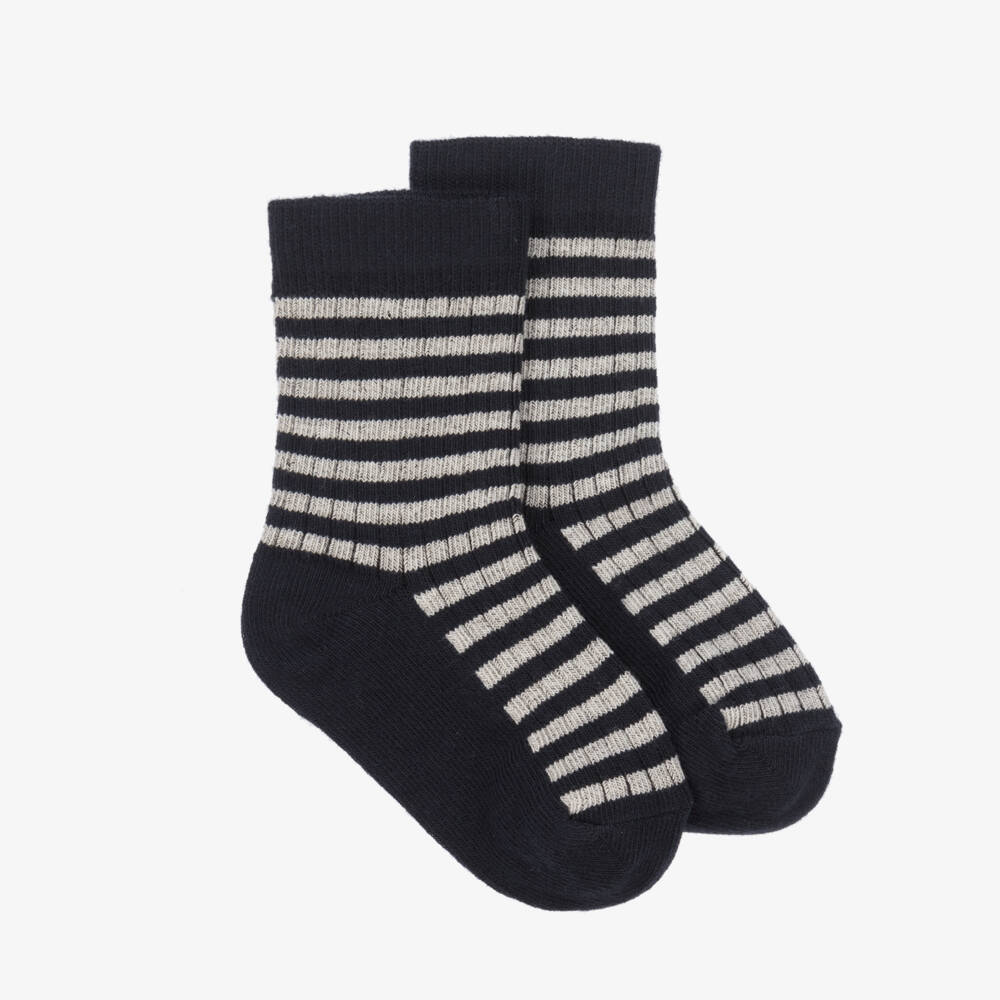 Navy blue and grey striped socks for little boys and girls by 1 + in the family. Made in a stretchy cotton blend, they are soft comfortable for little feet.