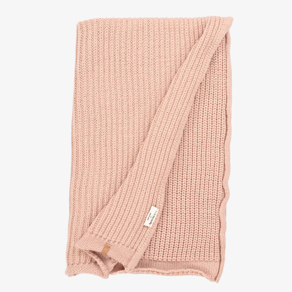 Lovely blush pink blanket for baby girls by 1 + in the family, knitted in a super soft wool blend. This chunky ribbed knit blanket has rolled edges and is a super cosy accessory for the nursery or when out and about in the pram or car seat.