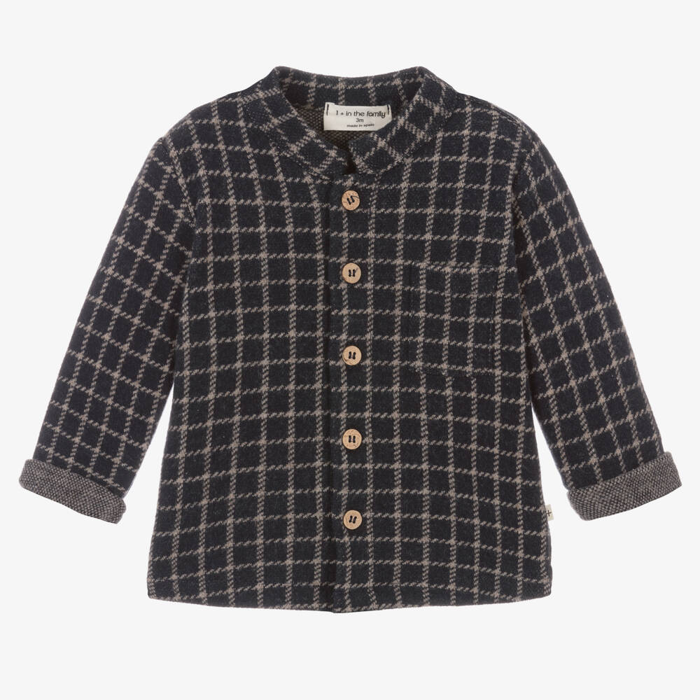 Navy blue and beige checked shirt for little boys by 1 + in the family, made in a mid-weight brushed cotton jersey blend. This casual design has a Nehru collar, a little patch pocket in the chest and turned-up cuffs. It has a little logo tab on one side and fastens with wooden buttons on the front.