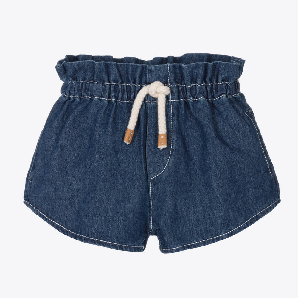 Sweet blue chambray shorts for little boys from 1 + in the family. They have an elasticated waist making them easy to pull on and comfortable to wear, whilst the decorative drawstring can be tied or bowed for differing finishes. The loose fit limits restriction when your little one moves around.