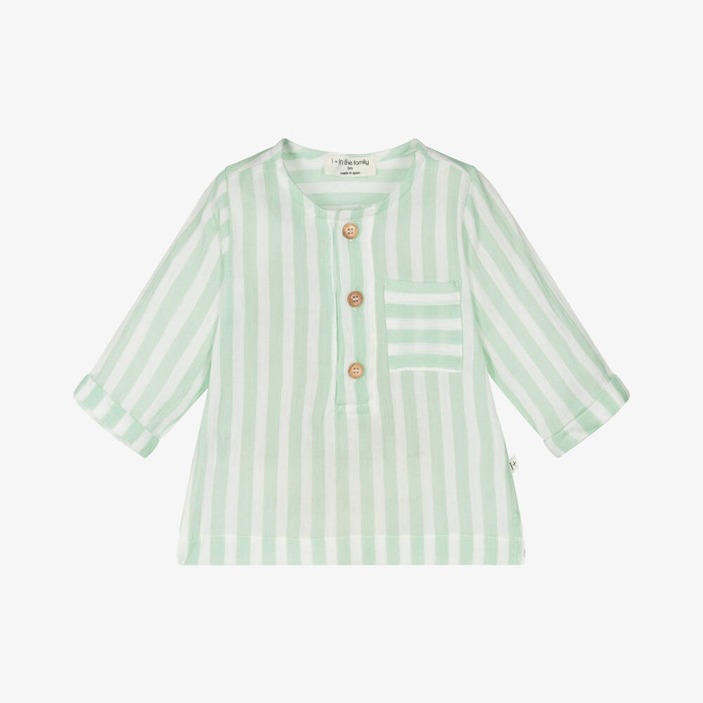 Pale green and white striped shirt for little boys by 1 + in the family, made in lightweight, slightly textured cotton. It has button fastenings on the half placket and a cute chest pocket on one side.