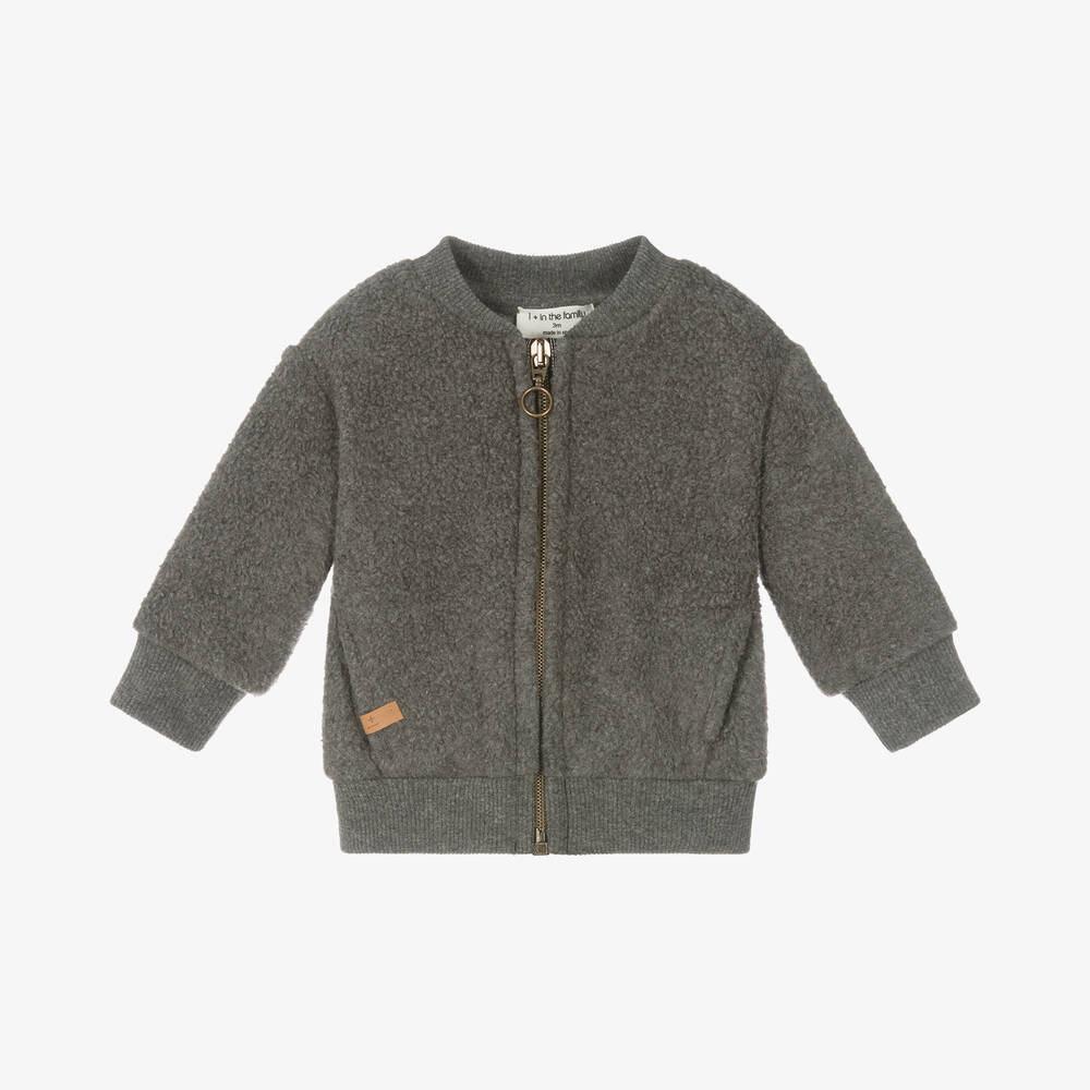 A dark grey zip-up top for younger boys from 1 + in the family. Cosy and comfortable, it is made in soft and stretchy cotton blend jersey fleece with ribbed trims and long sleeves. This casual layering piece is simply styled with two hand pockets and a little brown logo tab on the front.