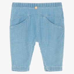 Casual and comfortable trousers for younger boys by 1 + in the family, in a black and dark grey houndstooth check pattern. They are made from super soft and stretchy cotton blend jersey with turned-up leg cuffs. Easy to pull on, they have an elasticated waistband with decorative ties on the front. An ivory logo tab can be seen on the side seam.