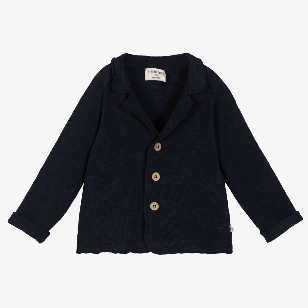 Casual navy blue marl cotton jacket for little boys by Spanish brand 1 + in the family. Made in comfortable knitted jersey, it has a revere collar, raglan sleeves, useful concealed side pockets and front button fastenings. A logo tab is sewn on one side seam.