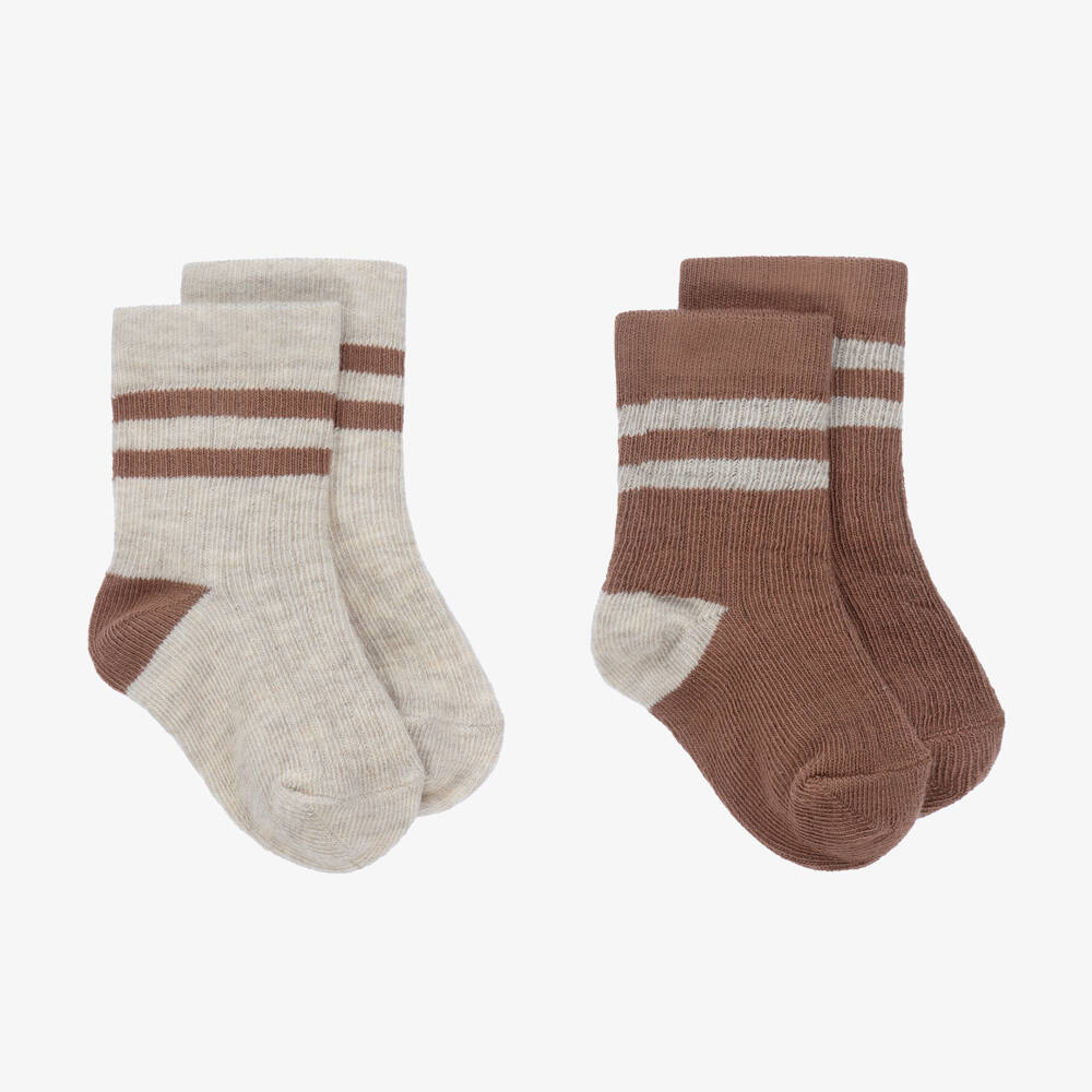 Cute beige and brown socks for little boys and girls by 1 + in the family, in a useful pack of two. They each have stripes around the ankle and the brand's logo knitted on the bottom of each foot.