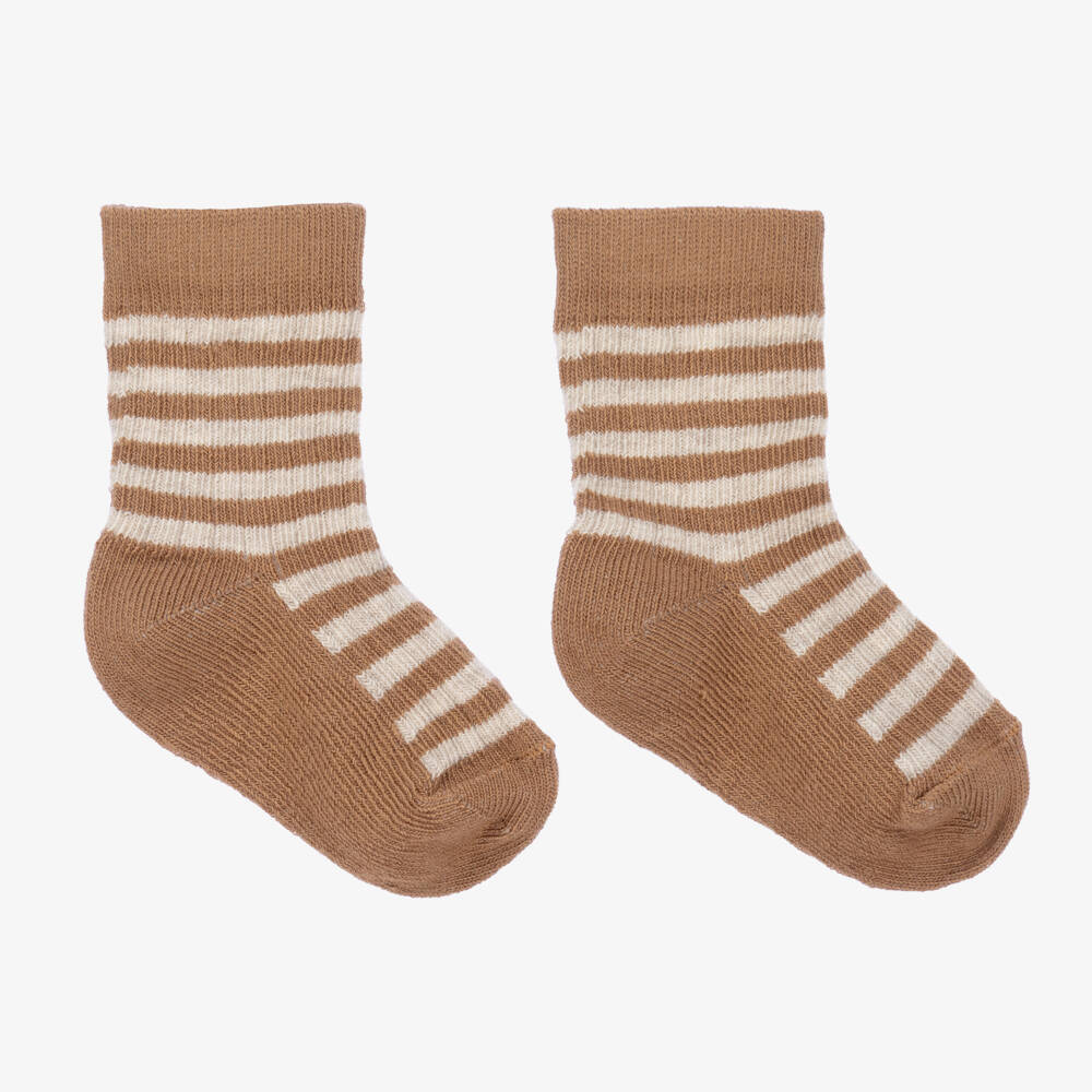 Brown and beige striped socks for little boys and girls by 1 + in the family. Made in a stretchy cotton blend, they are soft comfortable for little feet.