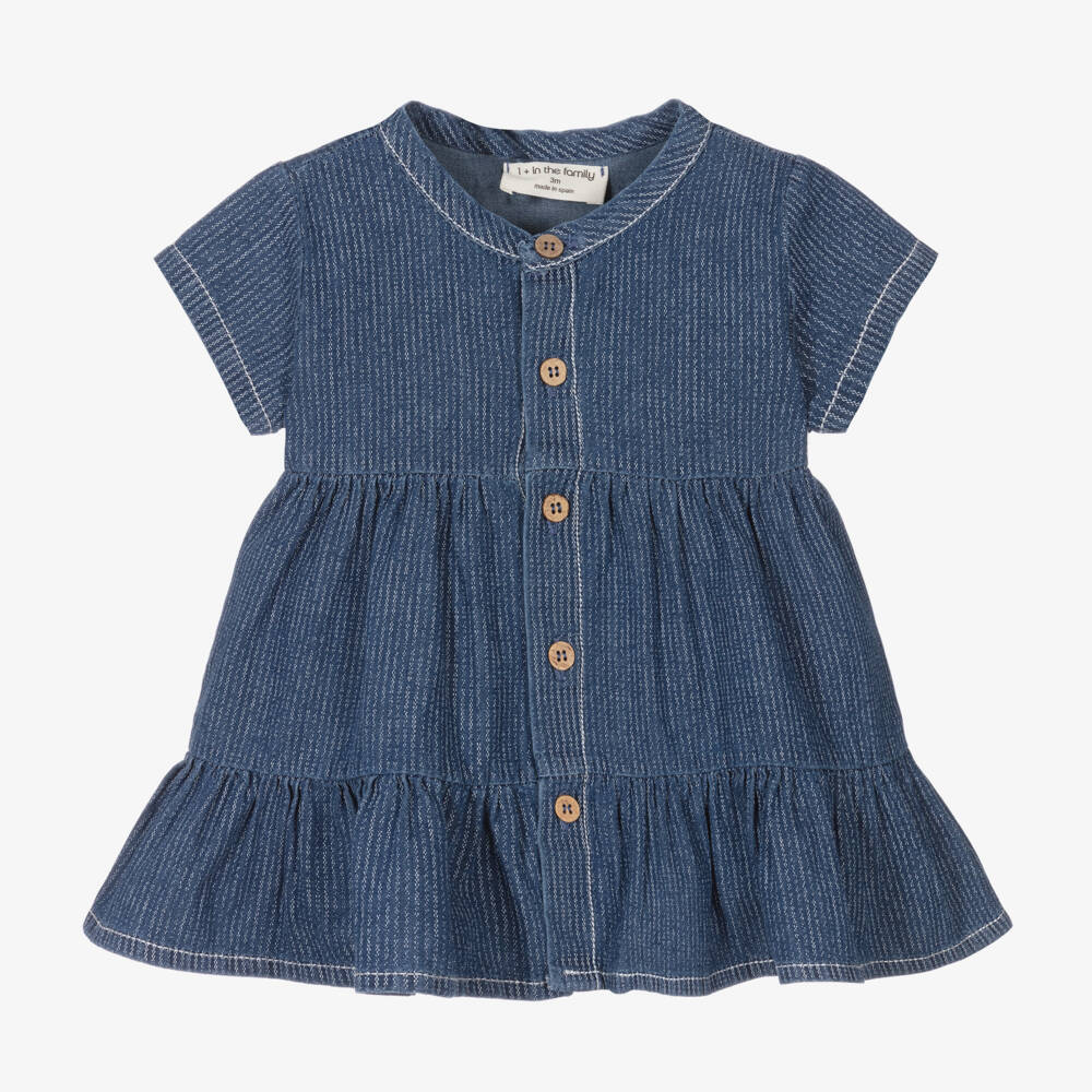 Sweet blue chambray tiered dress for little girls from 1 + in the family. It has capped sleeves and is lightweight, ideal for warmer days. The button fastenings are wooden for a cute finish.