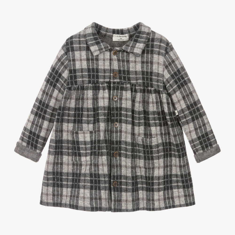 A lovely grey and dark grey checked shirt dress for younger girls by 1 + in the family. Stretchy and comfortable to wear, it is made in a soft brushed cotton blend jersey knit with a button-up front. It has a gathered waist, turned-up cuffs on the long sleeves and two pockets.
