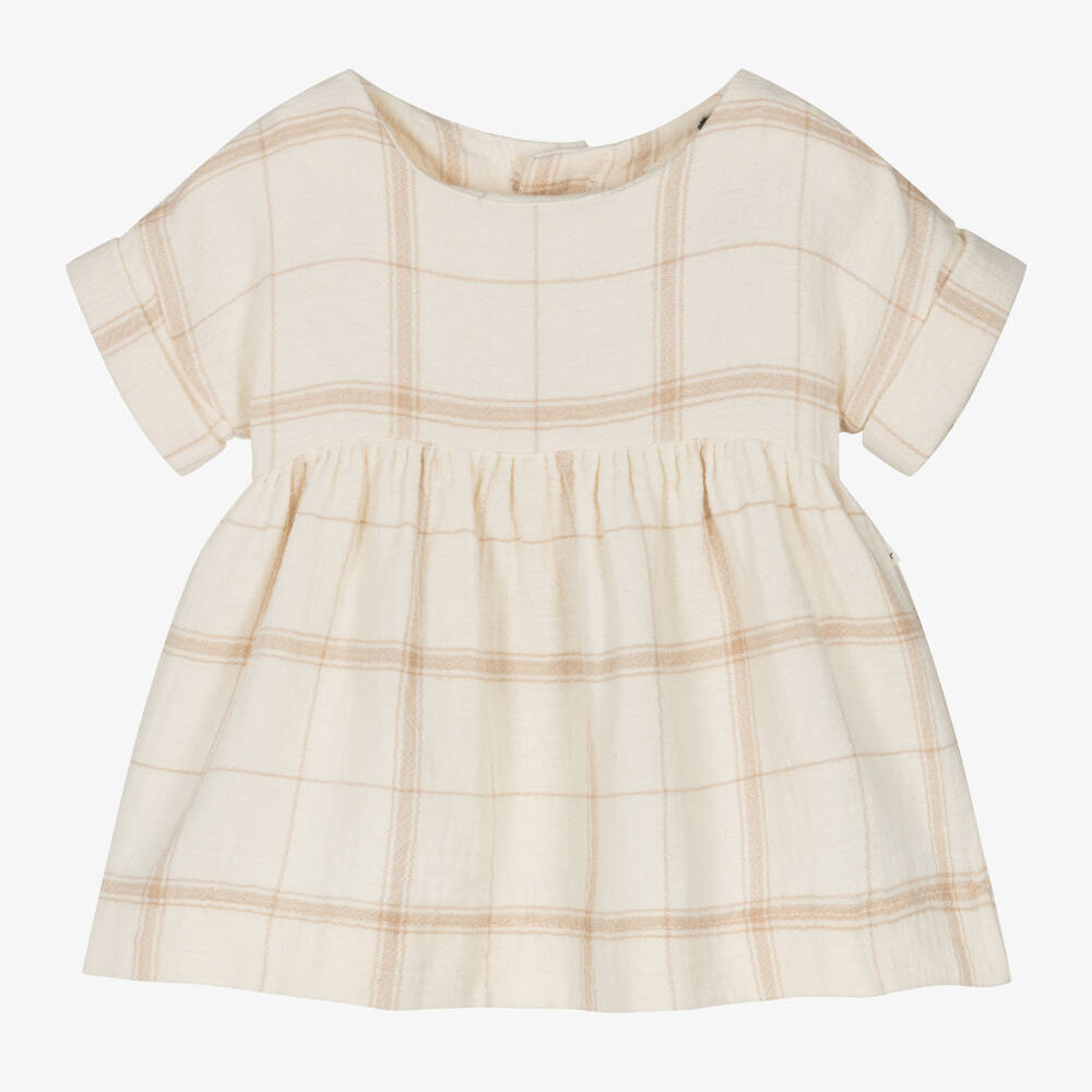 Ivory cotton dress for little girls by 1 + in the family, checked in beige. Lightweight, with a subtle lattice weave, it has cuffs that can be folded up or down. It fastens with buttons on the front and has a full, gathered skirt.